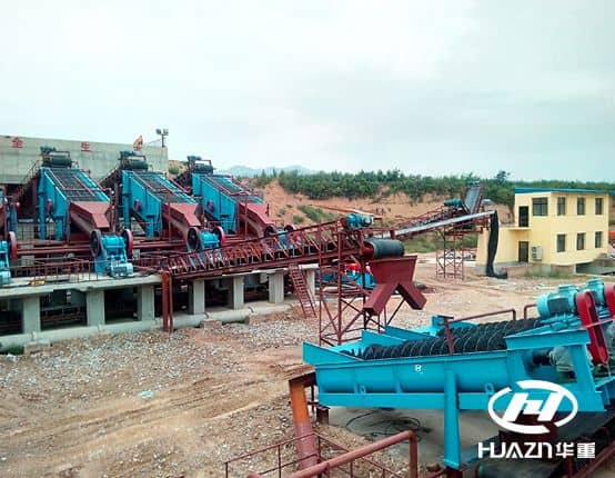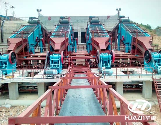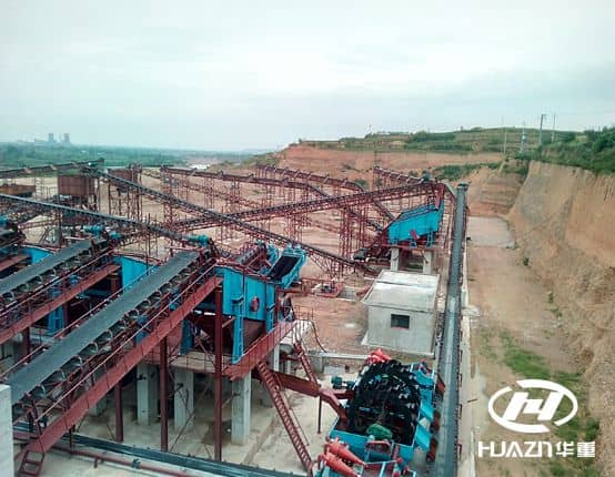 該系統(tǒng)位于陜西境內(nèi),系統(tǒng)以生產(chǎn)建筑用砂石骨料為主,系統(tǒng)設(shè)計規(guī)模為1200t/h。該系統(tǒng)由我公司實施工藝流程設(shè)計,主要設(shè)備制造,基礎(chǔ)施工設(shè)計,系統(tǒng)指導(dǎo)安裝,調(diào)試培訓(xùn),交付運行。破碎物料為開挖天然礫石料,且泥土含量較高,為了提高成品粒度的品質(zhì)、潔凈程度,該系統(tǒng)設(shè)計時,著重考慮了系統(tǒng)的篩分、水洗、脫泥工藝,設(shè)備配置為2YKRH2460重型篩4臺,ASD3625顎式破碎機4臺,HPY300圓錐破碎機4臺、3YKRH2473重型篩4臺,2XL1118洗石機2臺,DXS3.6斗輪洗砂機4臺,SH800細砂回收4臺等。