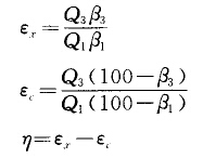 式中:η為篩分效率,%;Q1、Q2、Q3為入篩、篩上、篩廠固體廢物重量,Q1= Q2十Q3;β1、β2、β3為入篩、篩上、篩下固體廢物中小于篩孔的細粒累積含量,%; εx、εc為細粒采收率、粗粒采收率。