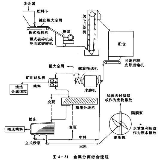 幾乎沒有一個廢物資源回收廠能備置得起一整套分離和回收利用各種金屬 的系統,因此,這些廢物一般都賣給其他處理廠。然而,通過選擇性地回收一種 或幾種有經濟效益的金屬是可以實現的.如圖4—30所示。