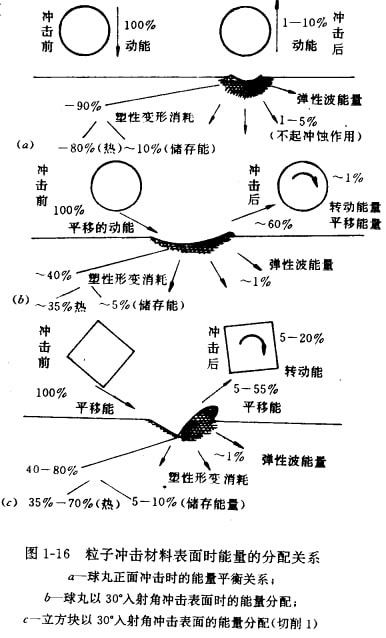 圖1-16是能量分配的示意圖。垂直入射的球九沖擊后僅剩下入射能量的1%-10%,其余大部分能量均失散在表面上,其中包括對沖蝕不起作用的彈性波損耗(1-5%)及塑性壓痕所消耗的大量能量(1-90%)。消耗在材料上的總能量有80%變成效而失散,約10%以形成品體位帶或其他晶體缺陷而儲存在材料內。斜射的立方塊和球丸在能量分配上顯示出另外的比例關系。
