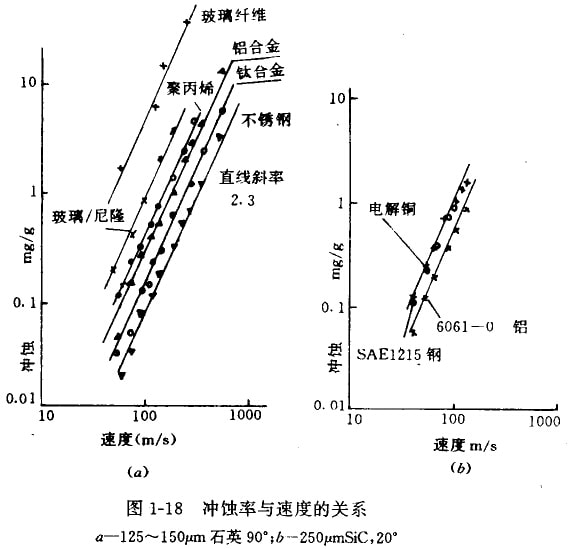 圖1-18為8種材料沖蝕率與速度的關系曲線。