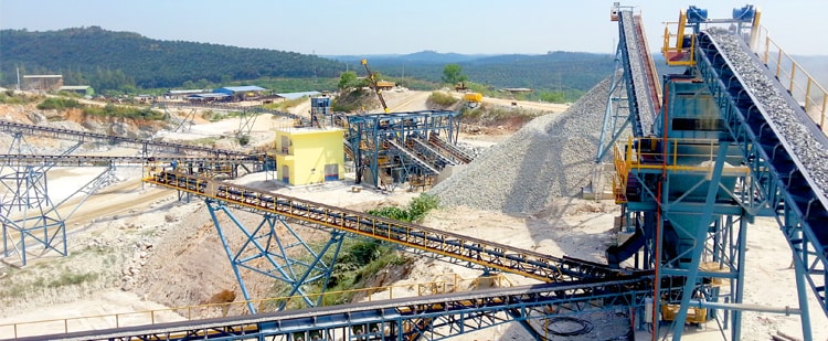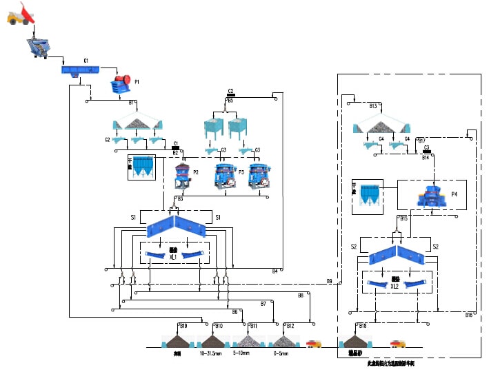 該生產線生產工藝主要適用于時產600噸花崗巖、玄武巖類硬性物料的加工破碎,將經過爆破處理或開挖、洞采小于1400mm的大塊毛料通過自卸車上料至原料倉,經過具有預篩分功能的棒條給料機均勻的供給顎式破碎機破碎,經顎式破碎機破碎后125-275mm的半成品物料通過皮帶機輸送給具有中細碎功能的圓錐破碎機進行二次破碎,經圓錐破碎機二次破碎后6-45mm的混合成品骨料經過皮帶機輸送至后續一篩車間進行分級篩分,篩分將大于用戶需要的大顆粒物料再通過皮帶機輸送至細碎圓錐破碎機進行破碎,破碎后的物料也進入一篩車間進行篩分,滿足客戶需要的合格成品通過皮帶機輸送至成品料倉,不符合要求的大顆粒再次返回細碎圓錐破碎機進行循環破碎。如果成品砂需要水洗也可在一篩下面配置洗砂機用于成品砂的水洗。該系統的棒條給料機還具有預篩分功能,可以將原料中的細顆粒物料提前分離直接進入后續的破碎設備,也可將原料中的泥土雜物作為棄料預先分離。