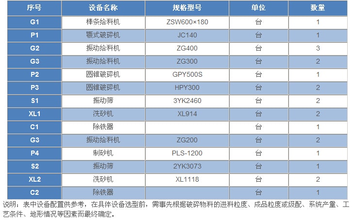 600t/h---花崗巖(玄武巖)類巖石的砂石骨料生產工藝設備配置表