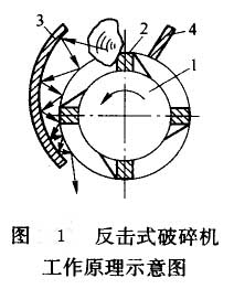 反擊式破碎機的工作部件為帶有板錘2的高速旋轉(zhuǎn)的轉(zhuǎn)子1;給人機內(nèi)的料塊在轉(zhuǎn)子回轉(zhuǎn)范圍(錘擊區(qū))內(nèi)受到板錘沖擊。物料是經(jīng)導板4給人錘擊區(qū)的,料塊被板錘沖擊后拋起;高速地撞在反擊板3上,再次受到?jīng)_擊,然后又從反擊板彈回板錘,繼續(xù)重復上述過程。在往返過程中,物料還互相碰撞,在沖擊、反彈、相互碰撞等作用下,物料料塊不斷產(chǎn)生裂縫、松散最后破碎.破碎的物料從機體下部卸出。參見圖1。