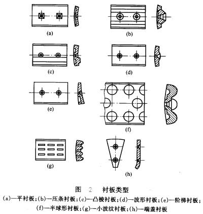常用襯板的形狀見圖2,形狀較平滑的襯板使鋼球同襯板之間的相對(duì)滑動(dòng)較大,產(chǎn)生鉸多的研磨作用,在相同轉(zhuǎn)速下鋼球被提升的高度和拋射所耗的功較少,適于細(xì)磨。凸起部較高的襯板對(duì)鋼球的推舉作用強(qiáng),使鋼球能升至較高的位置,沖擊作用較強(qiáng)。橡膠襯板耐磨損(壽命比猛鋼材板高2—3倍)重量輕(比錳鋼襯板輕約85%)、拆裝方便、噪聲小。