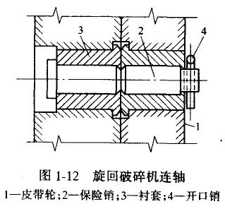 旋回破碎機的保險裝置,主要是利用連接傳動蝕和三角皮帶輪的聯細節土的保險銷,當過負荷時或破碎機中落人大塊非破碎物時(如電鏟齒),保險銷即被招斷,達到保險的日的。其裝置如圖1—12所示,它由四個保險銷組成,裝在聯軸節上,用以連接傳動軸和i角皮帶輪。