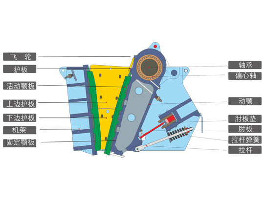 顎板可以根據(jù)破碎物料的不同選擇不同的牙型,使破碎效果更好,為了提高顎板的耐磨性,動(dòng)顎上方安裝了重型護(hù)板,避免因物料沖擊,有效保護(hù)動(dòng)顎體及其內(nèi)部軸承不受損壞。